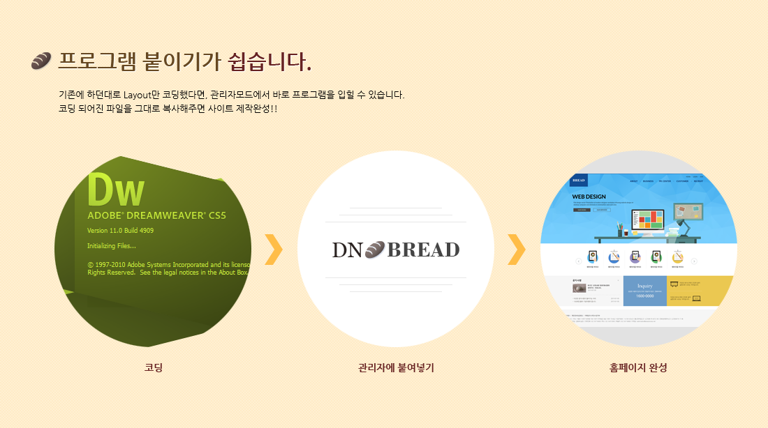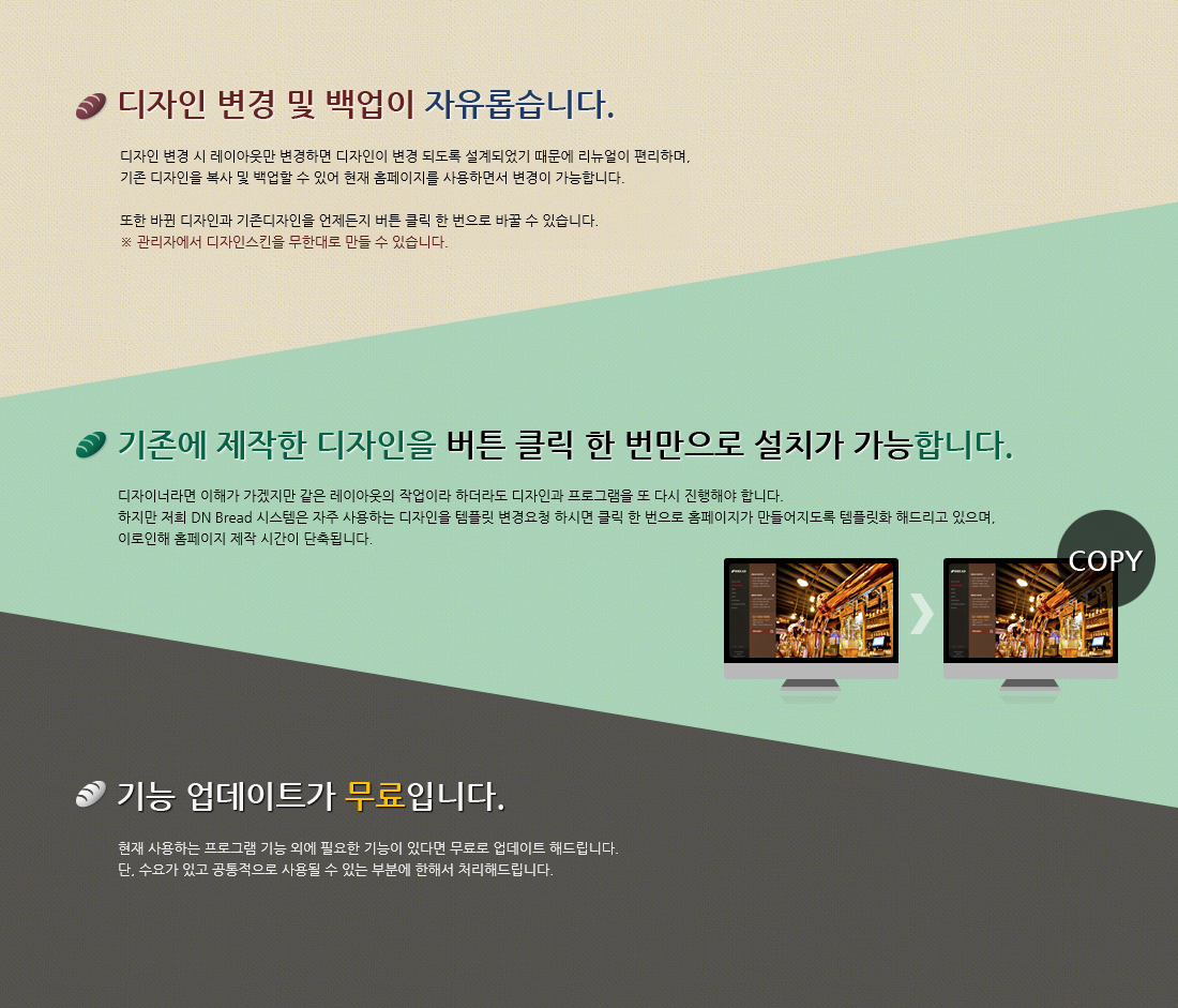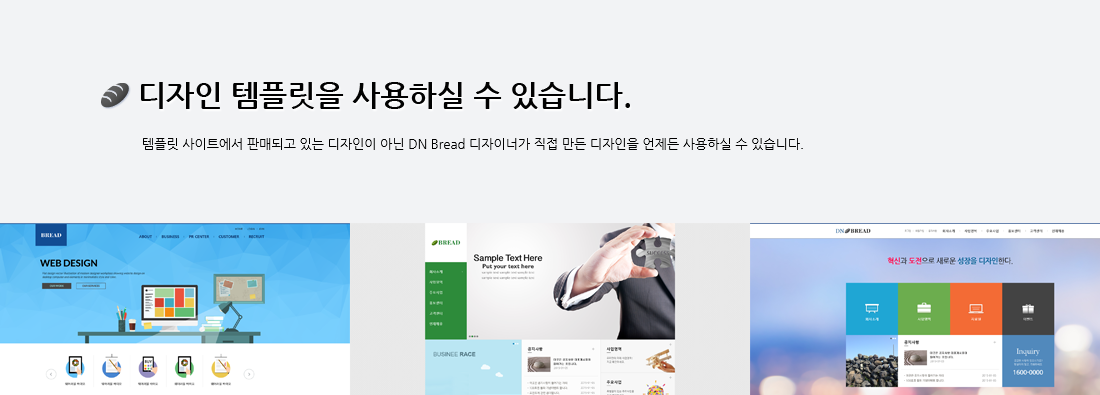템플릿 사이트에서 판매되고 있는 디자인이 아닌 브레드아이 디자이너가 직접 만든 디자인을 언제든 사용하실 수 있습니다.