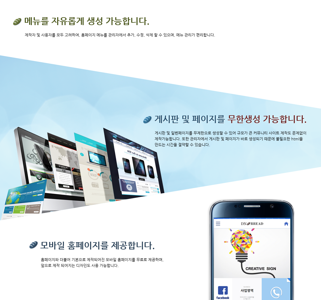 제작자 및 사용자를 모두 고려하여, 홈페이지 메뉴를 관리자에서 추가, 수정, 삭제 할 수 있으며, 메뉴 관리가 편리합니다.