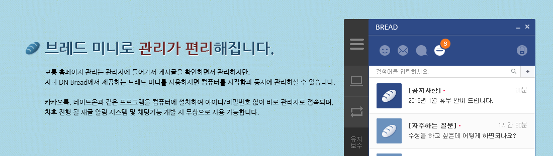 보통 홈페이지 관리는 관리자에 들어가서 게시글을 확인하면서 관리하지만, 저희 브레드아이에서 제공되는 브레드미니를 사용하시면 컴퓨터를 시작함과 동시에 관리하실 수 있습니다.